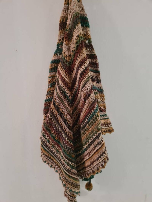 Chal de crochet triangular , en colores degradados del beige al marrón oscuro, colores que evocan el bosque con detalle de pompones en las esquinas